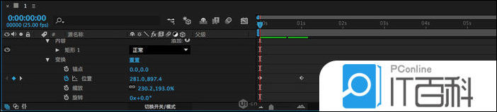 2.因为比较简单的效果,这里我是直接在AE里面绘制一些简单图形,放到图层窗口中,我们先做一个位移的效果,举一反三很快就能上手了。点击三角符号展开图层的各种效果属性,打开变换,右侧调节时间,我们是从0s开始所以把指针拖到00s,点击位置前面的类似闹钟的图标,开始记录关键的帧数。