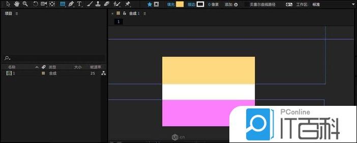 用上面的矩形画两个大小为560*210(宽高合适也行,不一定要这个)的矩形,填充一些不同的颜色,拖动到画布外面对齐,利用位置关键帧来调节,沿着Y/X轴坐标参数,从画布外向中间移动就可以了,具体的参数自己把握。