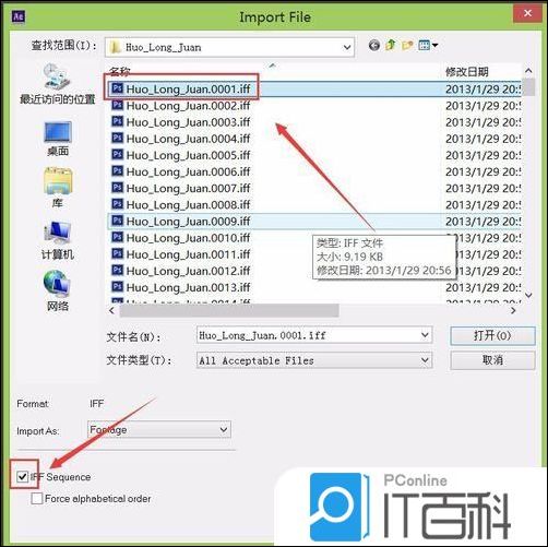 3、在该对话框里找到我们的文件,选择第一张图片, 并勾选IFF Sequence前的复选框 ,如图所示: