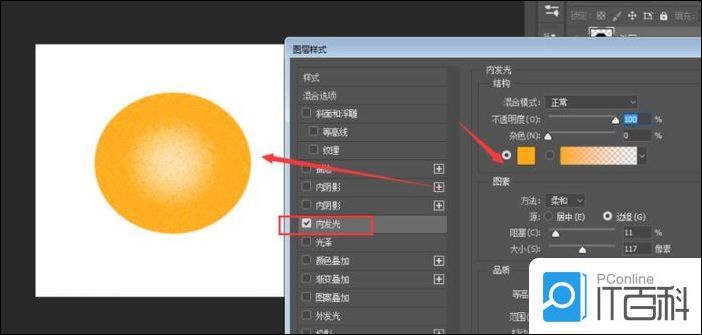 接下来,打开图层样式,首先选择内发光。通过选择一个适合的颜色,并适当调整杂色和不透明度,来增加内部发光的效果。