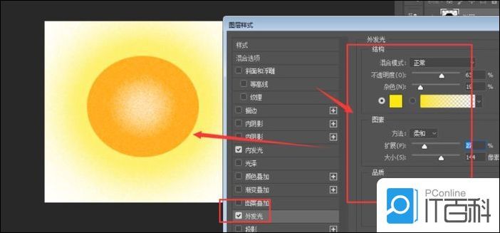 接着,打开外发光效果,我们将为太阳添加一个金色光环效果。根据示意图进行设置,让光环看起来更加真实。