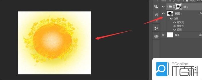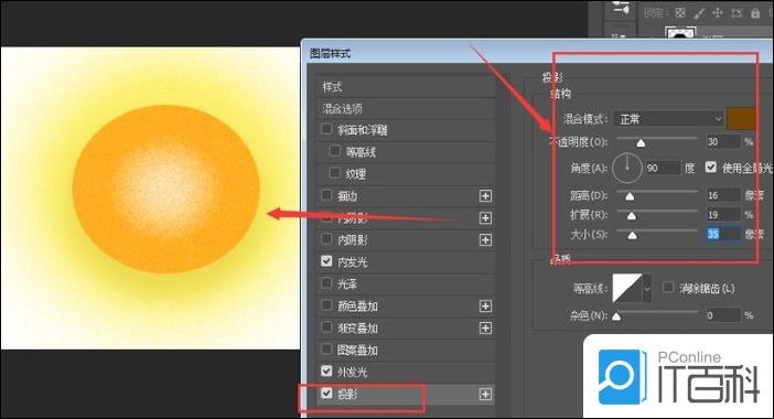 为了使整个太阳看起来更有立体感,我们需要添加一些投影效果。选中图层后,打开投影样式,并根据示意图调整投影的参数,使它与太阳形成逼真的立体效果。