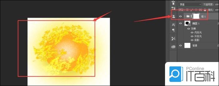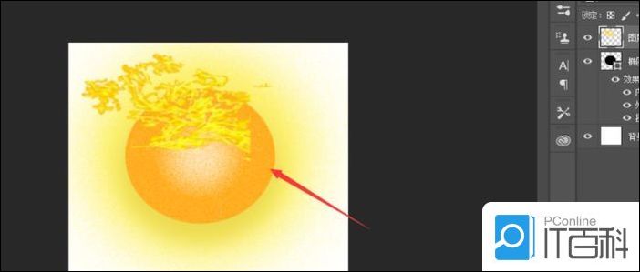 为了遮挡掉超出太阳形状的火焰,我们需要在所有火素材的图层上添加蒙版。使用柔和的黑画笔,在椭圆中心的火焰上轻轻涂抹,以便将多余的火焰涂抹掉,使其更贴合太阳形状。
