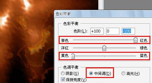 7、按下 Ctrl+b ,打开 色彩平衡 ,这里按照如下调整一下色阶值,这样就可以社指出一个简单的火焰效果了。