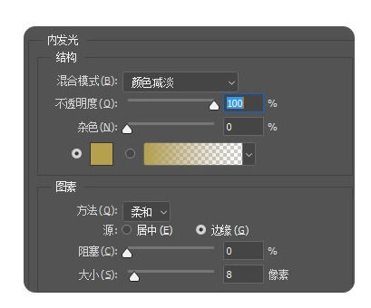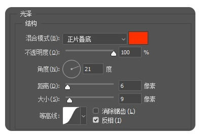 4、添加效果:内发光、光泽、颜色叠加、外发光,数值可以参考下面