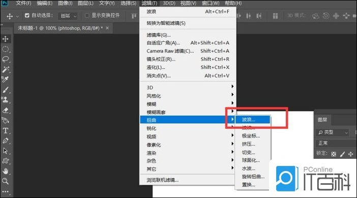 现在,点击菜单栏的【滤镜】,然后选择【扭曲】,再选择【波浪】。这将打开扭曲滤镜的参数设置窗口。
