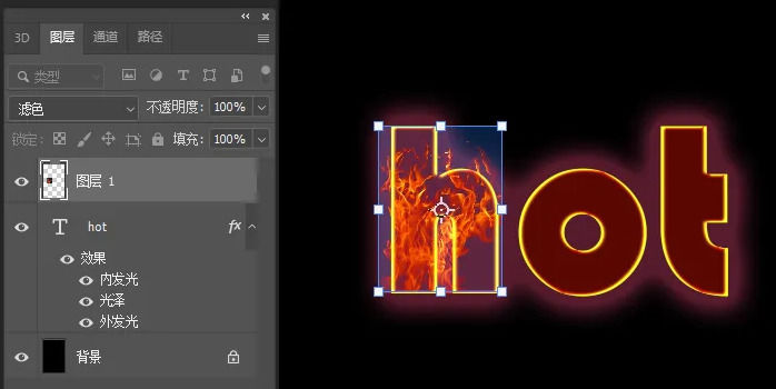 2、然后再拖入一个 火焰素材 , Ctrl+t调 整 一下大小位置,混合模式这里选择 滤色 。