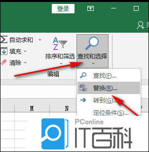 3、在“开始”工具的子工具栏中我们找到“查找和选择”工具,然后点击打开该工具下方的箭头图标,然后在下拉列表中点击选择“替换”选项。