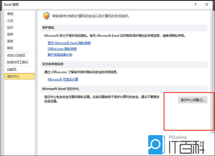 6、右侧页面将会显示出相关的功能选项,用户需要按下信任中心设置按钮。