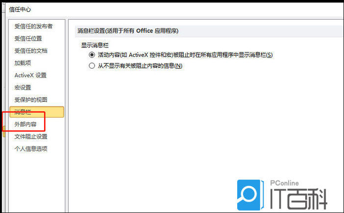 7、在打开的信任中心窗口中,用户在左侧选项卡中点击外部内容选项卡。