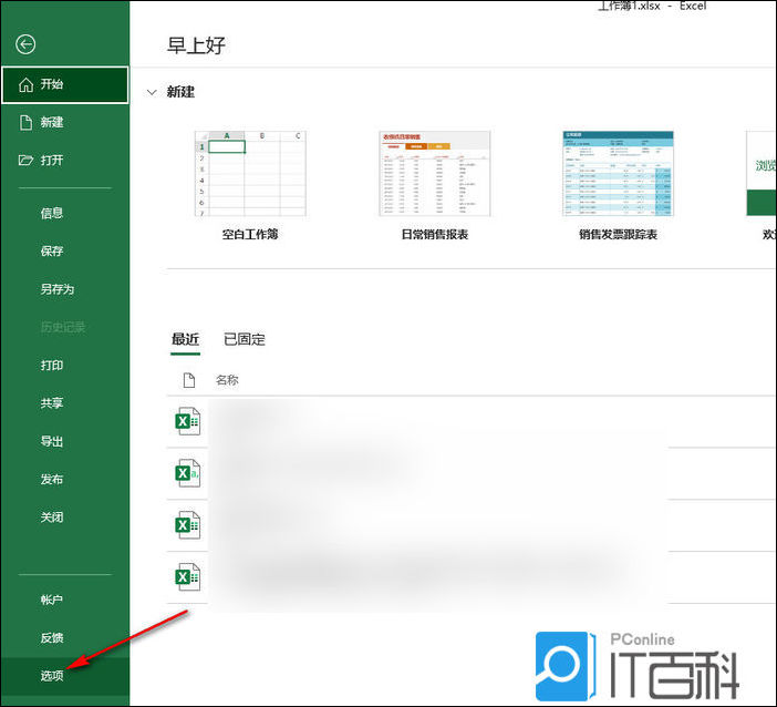 5、在文件页面的最下方找到“选项”,点击打开该选项,进入Excel选项页面。