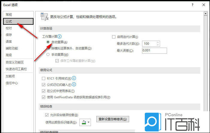 6、在Excel选项页面中,我们先点击“公式”选项,然后在工作簿计算页面中点击选择“自动重算”选项,最后点击页面下方的“确定”选项即可。