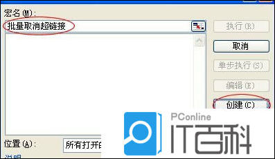 在弹出的“宏”窗口中的“宏名”中输入“批量取消超链接”再单击“创建”按钮。