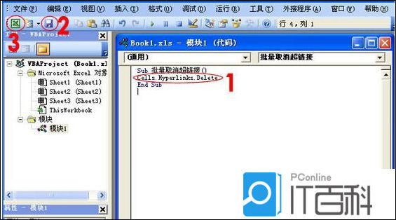 此时会进入Excel模块界面中:在“Sub 批量取消超链接()”与“End Sub”之间输入代码:“Cells.Hyperlinks.Delete”。单击“保存”按钮,将其保存起来。单击“视图 MicrosoftExcel”返回到Excel界面中。