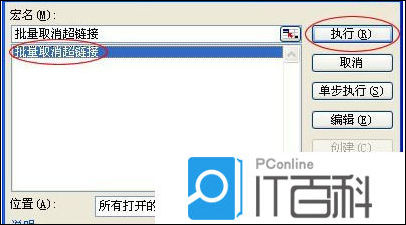 返回到Excel界面中后,单击菜单栏的“工具”-宏-宏,在窗口中选择先前创建的“批量取消超链接”宏,单击“执行”按钮即可。