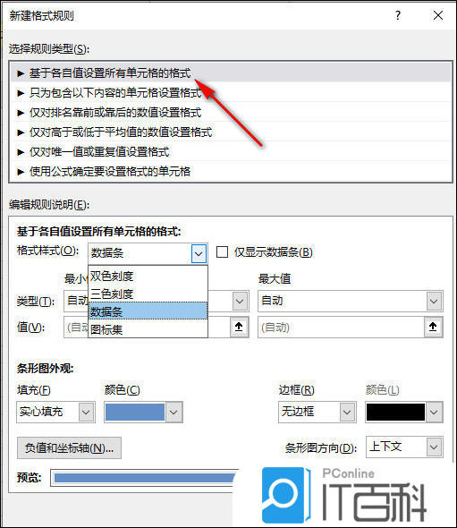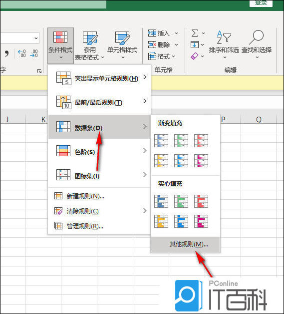 2、之后就会弹出一个下拉选项框,我们需要在该窗口中将【数据条】这个选项点击一下,然后在复选项中将【其他规则】选项点击进入到页面中。