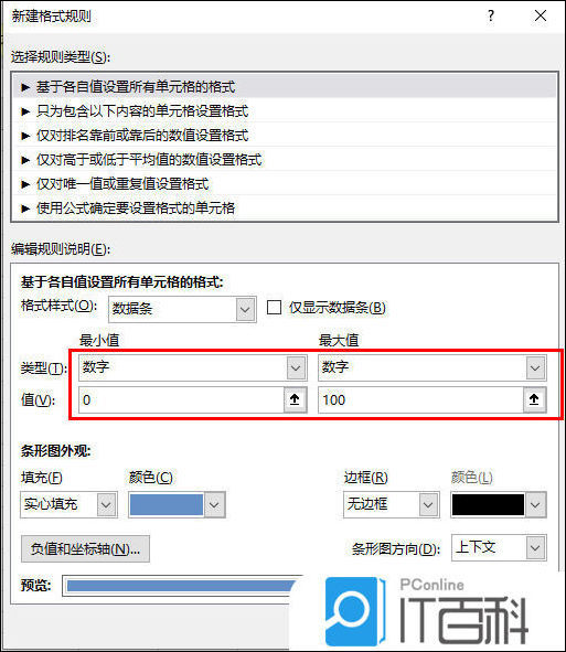 4、然后再在下方的【最小值】和【最大值】那里选择【类型】为【数字】,然后将最小值的值数字为【0】。将最大自的值设置为【100】。
