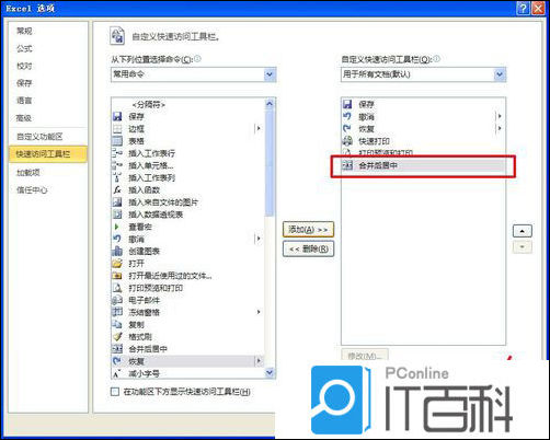 最后点确定,“合并后居中”这一按钮就添加到“快速访问工具栏”了。