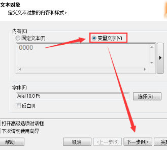 然后点击标签模版空白区,在弹出的 文本向导 对话框中,设置文本的内容内容选择变量文字在点击下一步。