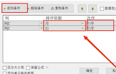5、最后我们添加条件,选择“ 日 ”,“ 月 ”升序排序即可。