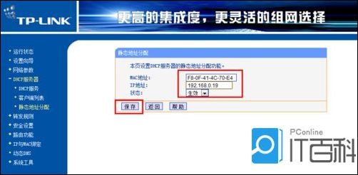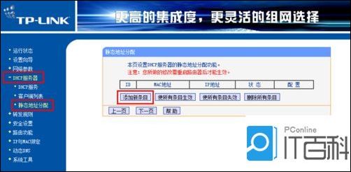 6、将副路由器IP与其MAC进行绑定。切换至“静态地址分配”选项卡,然后点击“添加新条目”按钮,将将副路由器IP与其MAC地址进行绑定,这样就确保在进行动态IP地址分配时副路由器的IP地址始终为“192.168.0.19”。
