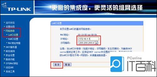 8、依次展开“网络参数”→“LAN设置”,将IP地址设置为“172.16.1.1”,子网掩码设置为“255.255.255.0”,最后点击“确定”按钮重启路由器。