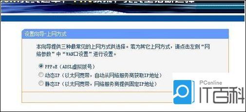 进入上网方式设置,我们可以看到有三种上网方式的选择,如果你家是拨号的话那么就用PPPoE。动态IP一般电脑直接插上网络就可以用的,上层有DHCP服务器的。静态IP一般是专线什么的,也可能是小区带宽等,上层没有DHCP服务器的,或想要固定IP的。因为我拨号所以选择pppoe。(PS:一般家庭用户都是选择PPPoE,也就是ADSL虚拟拨号上网)