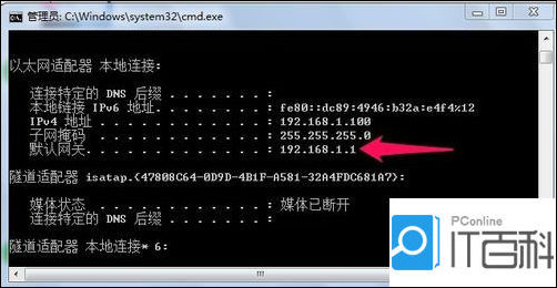 在命令提示符窗口中输入命令ipconfig,然后回车!