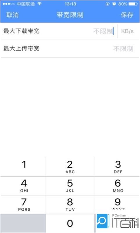 4、限速:点击“ 带宽限制”, 设置“最大下载带宽”和“ 最大上传带宽”, 点击 “保存”。