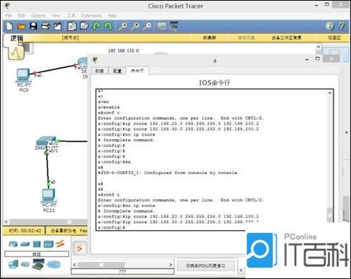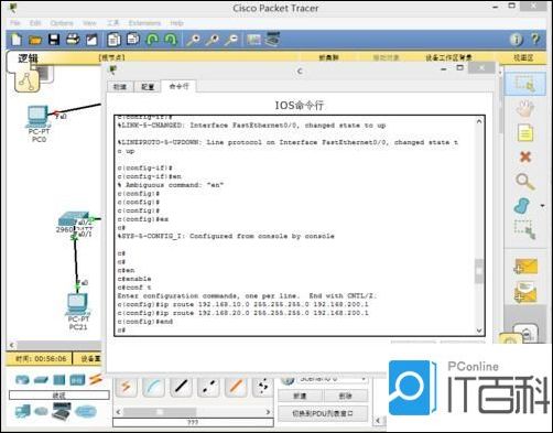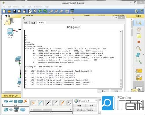 用“show IP route”命令在各台路由器上查看各台路由器的路由表,再用ping命令ping一下各台PC间的连通性,这时只有PC0与其他计算机不能通信,