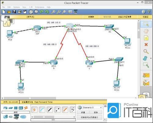 首先打开思科模拟器软件,找出Cisco 2811路由器4台,cisco 2960交换机3台,PC 4台,将它们按相应的顺序排列起来,并用相应的双绞线将它们连接起来,