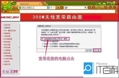 如果我们的电脑是用宽带连接上网的,则点击:让路由器选择自动上网方式,再点击:下一步;