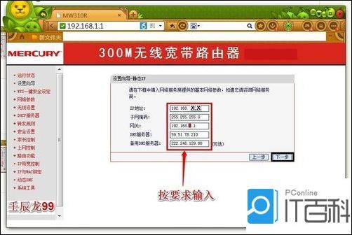 在设置向导 - 静态IP窗口,我们按要求输入局域网网管给出的IP地址和网关、DNS(地区不同,DNS不同,图片中的DNS是湖南娄底的),再点击:下一步;