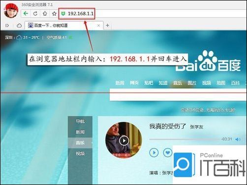 2、打开浏览器,在浏览器地址栏内输入: 192.168.1.1 并回车进入。