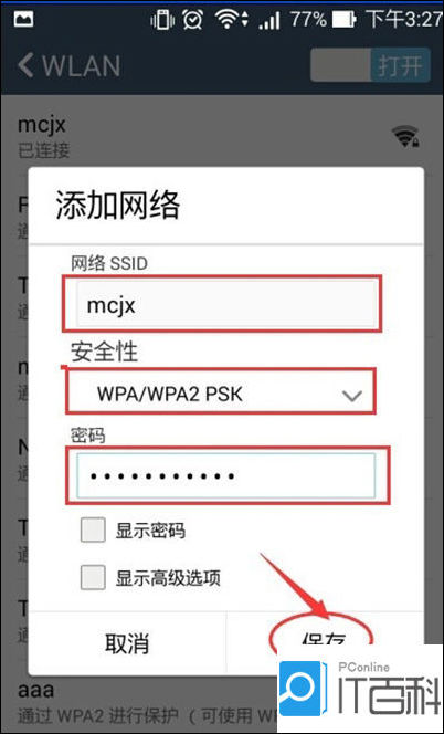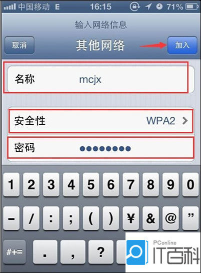 依次输入信息,注:网络名就是之前的,安全密钥就是,输入信息完毕就点击确定,再确定。请参照图片: