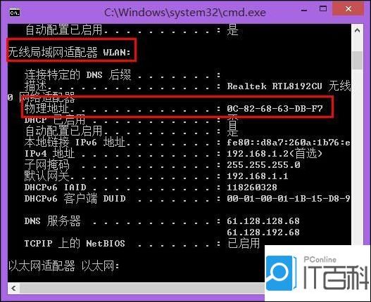 (4)、在运行结果中找到无线局域网下面的物理地址一行,后面的值就是网卡的MAC地址,笔记本的无线MAC地址是: 0C-82-68-63-DB-F7