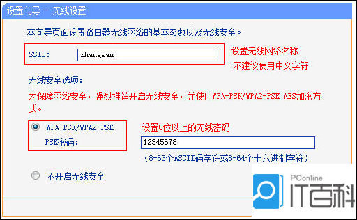 5、无线WiFi设置:设置“SSID”,SSID就是无线WiFi名称,用字母和数字的组合,不能用汉字和特殊字符——>选择“WPA-PSK/WPA2-PSK”——设置“PSK密码”,PSK密码就是无线WiFi的密码——>点击“下一步”。