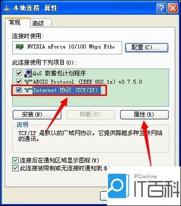 3、然后在右键点击网上邻居 - 属性! 然后在右键点击本地连接 - 属性! 然后会出现下图! 点击Internet协议。 然后点击属性!!