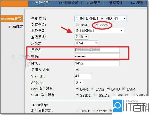 4、封装类型选 PPPoE ,连接模式选择成路由;选过以后在最下面会再多出 用户名和密码的输入框 ,输入自己的宽带帐号和密码,其它设置默认不动。