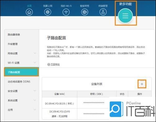 2、选择“ 更多功能 > 子路由配置 ”,单击“ 设备列表” 右上角的 “ + ”图标。