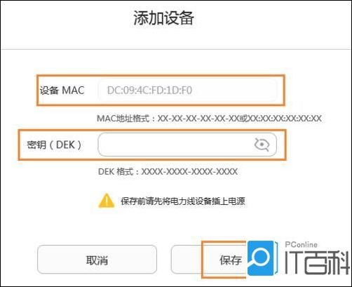 4、然后将子路由插到与母路由同一房间尽量靠近的墙插上,在浏览器“ 添加设备 ”页面中输入单买的子路由底部铭牌上的 MAC 地址和 DEK 码 。输入完成后,确认子路由灯在闪烁时,点击页面上的“ 保存 ”。