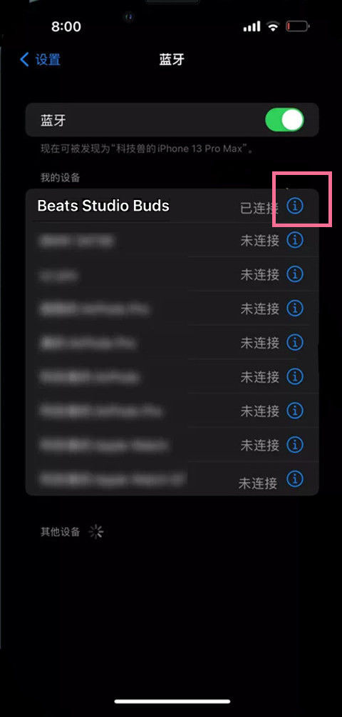 2、找到耳机并点击后面的i图标,进入到耳机详细设置中。
