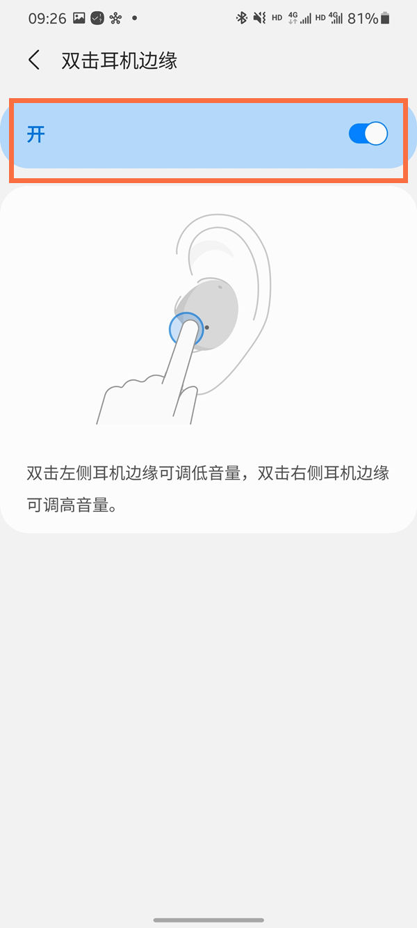 3、将“双击耳机边缘”的开关开启,双击左侧耳机边缘可调低音量,双击右侧耳机边缘可调高音量。