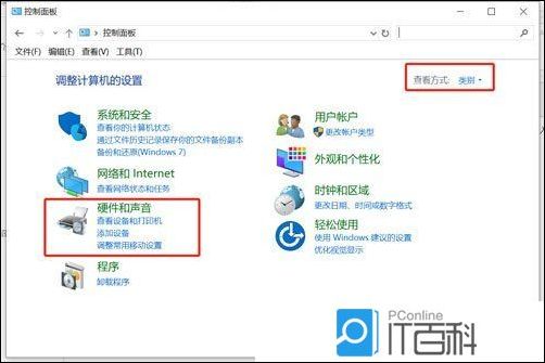 2、控制面板窗口,右上角切换类别查看方式,然后点击硬件和声音;