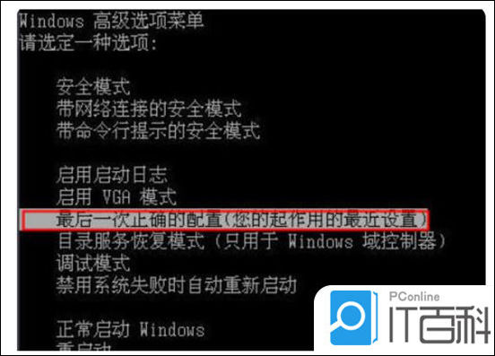 2. 若重启无法进入,则按下电源键,期间不断按下“F8键”打开高级启动选项,选择“最后一次正确的配置”回车执行。