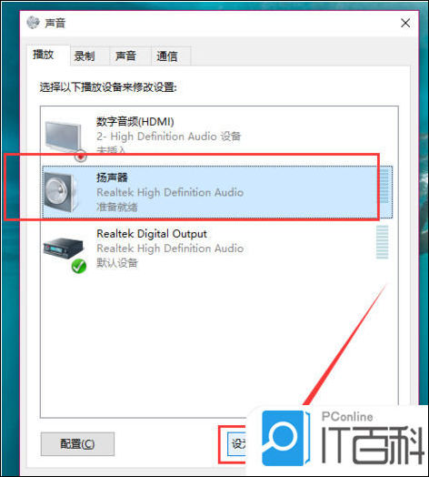 3. 接下来,我们只需要点击“扬声器”设备,然后点击页面最下方的“设为默认值”按钮,将声音播放设备默认设置为扬声器,一般情况下是可以解决没有声音的问题的。
