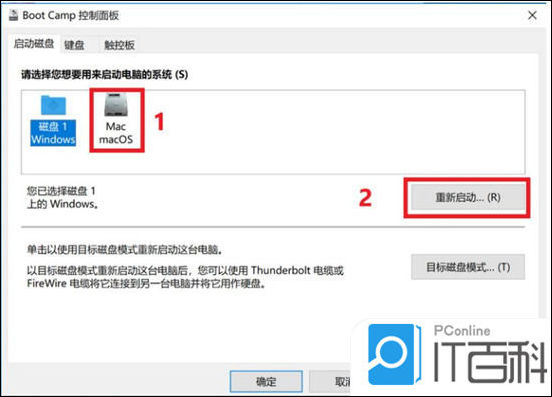 2、 在BootCamp控制面板的启动磁盘里,选择Mac OS系统,点击 重新启动 ,这样后面开机都是从MacOS启动了。