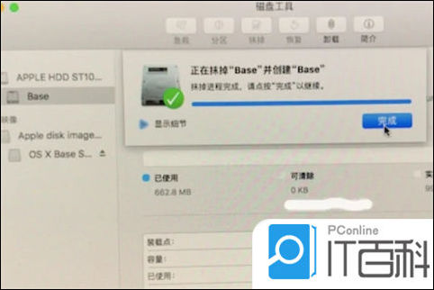 3. 擦除硬盘的内容,选择主硬盘(系统盘),主硬盘格式选择“Mac OS扩展(日志式)” 或者是英文的“Mac OS Extended (Journaled)”,点击选择选择抹掉。点击完成选项,关闭对话框;