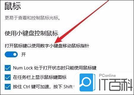 4、在右侧的窗口中,找到“打开鼠标键以使用数字小键盘移动鼠标指针”设置项。