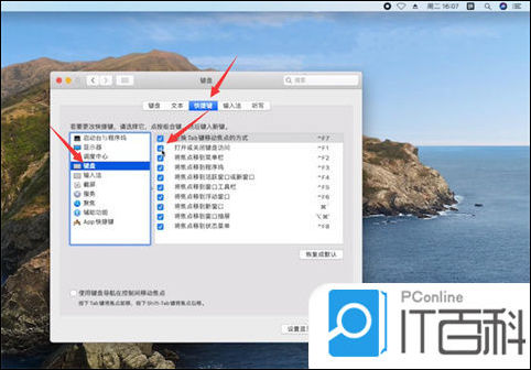 2、切换到快捷键选项,点击键盘,确保开启了打开或关闭键盘访问,使用Control+F1,可以锁定键盘与解锁键盘。
